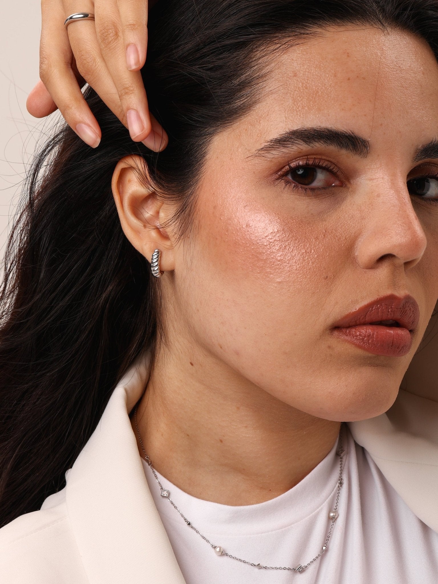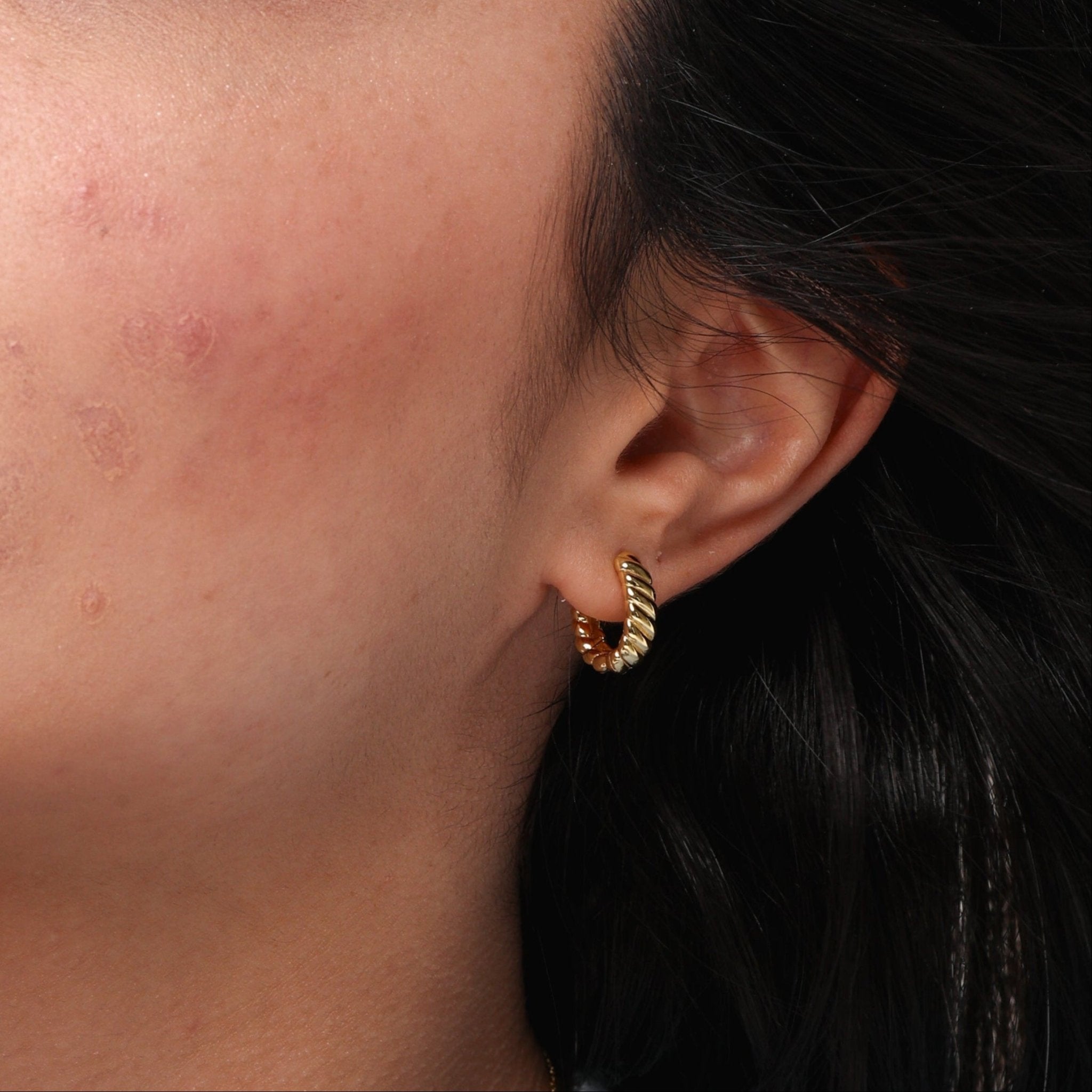 These croissant-inspired huggies feature a beautifully textured, curved design that brings a fresh twist to a timeless silhouette. Chic and understated, they add subtle yet distinctive flair to any look.