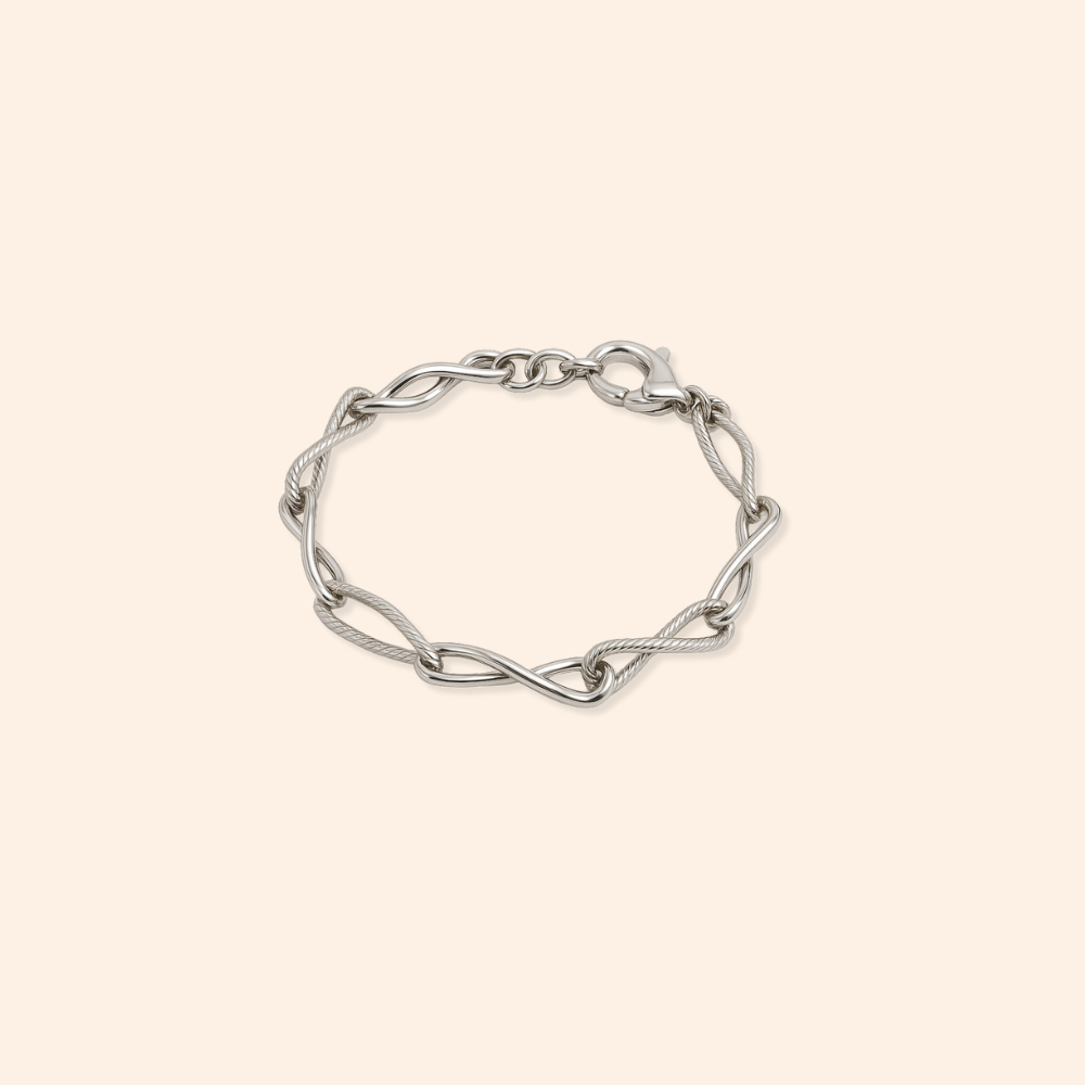 An elegant play of curves and texture, this bracelet features interlocking links with a diamond-cut finish that reflects light from every angle. Crafted in sterling silver, itโs lightweight, stylish, and easy to wear every day. A secure clasp keeps it in place, whether worn alone or with other bracelets.